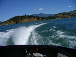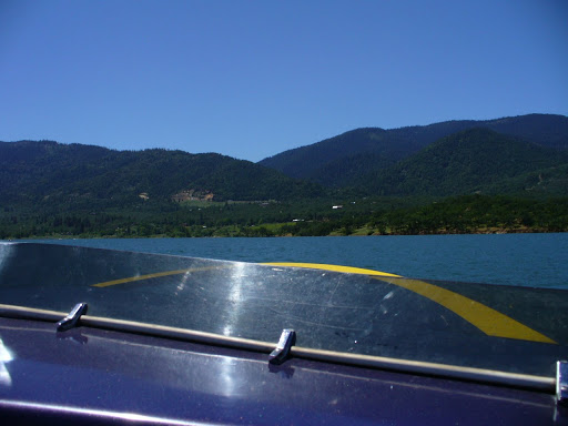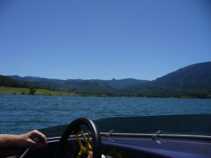 We took our boat to Emigrant Lake in Ashland, Oregon, which is about 30 minutes from our house. Emigrant Lake isn’t that big, and it is at the bottom of some big hillsides, so almost like a mountain lake.