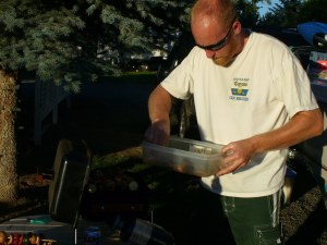 Later that night Chris and I prepped dinner for the crew, serving marinated beef, chicken and veggie skewers, along with my famous (recipe stolen from a good friend) pasta salad. It is the easiest pasta salad in the world to make, and a huge hit with almost everyone. It is GREAT for potlucks and parties.