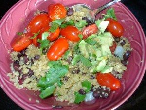 I actually really love this lunch. It is leftover quinoa with black beans added. I heat it up in the microwave with a little garlic and cumin; then I add some fresh chopped cilantro and tomatoes. Sometimes I throw in some onion, too. And this time, to get a little good fat, I added a bit of avocado. WOW…talk about good and the different textures really make this yummy.