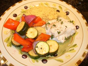 cooked on the grill and then served alongside some seasoned grilled cod and couscous.