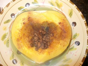 Now, I’m not a huge fan of acorn squash. I eat it periodically because Chris likes it, but it has never been my favorite. He wanted some and it is within the guidelines for my cleanse, so I made it. I served his with the traditional butter and brown sugar, but for me (no sugar or butter!) I added some raisins, cinnamon and a tiny drizzle of honey. It was good.