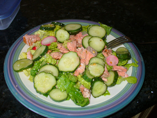 As I said in yesterday’s post, I used some of the leftover salad to top my lunch! The pic above is some chopped romaine, topped with leftover grilled salmon and leftover sesame cucumber salad. I used some of the cucumber salad dressing to drizzle over the top of this salad.