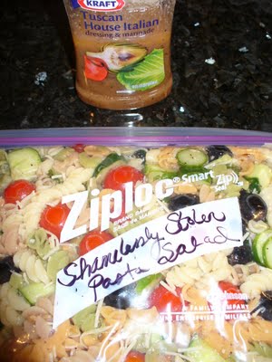 For example, for this weekend I made my Shamelessly Stolen Pasta Salad, which is great for camping because it makes a lot and travels well. I made the whole thing today and tossed it into a big gallon zip lock bag. DONE. Now when we go to eat it all we have to do is shake up the bag and add a little extra dressing if it needs it. We can serve it right out of the bag; the bag stays pretty well sealed; and if we do happen to eat it all, the bag can go in the trash instead of having dirty dishes to deal with or take back home.