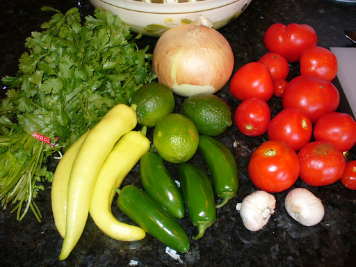 Tomatoes, onion, garlic, jalapenos, banana peppers, cilantro, lime, salt, pepper! SO YUM!