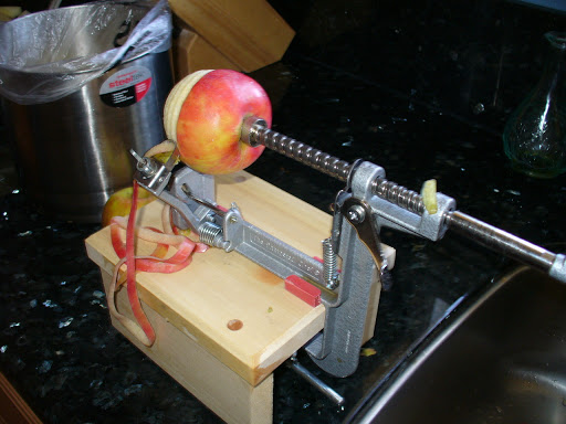 First, you have to wash, peel, core and slice the apples. For this, the best thing to have is an apple peeler. Now the one I have is actually called an apple peeler-coorer-slicer, because depending on how you configure the parts you can just peel, or peel, core and slice. The problem: too small of slices. The slices need to be a little more meaty for my purpose, which is ultimately, pies.