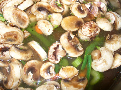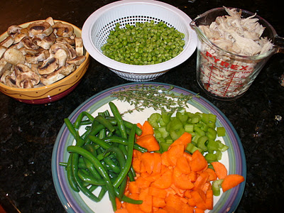 Also, in addition to this recipe being a great way to use up that leftover turkey, it is also a great way to use up those freezer burned peas and whatever other “needs to get used up TODAY” veggies you have hanging around in your crisper drawer. This time I added a bunch of mushrooms, and because I had fresh thyme and not fresh parsley, I used that instead. BE creative! Use what you have on hand. Don’t like celery? Fine…add something else. Want some garlicky flavor? Cool, add some garlic or garlic powder. Use this recipe as a base and suggestion, but utilize what you have available.