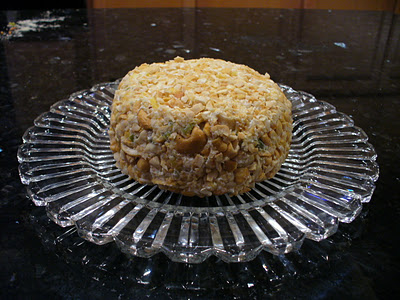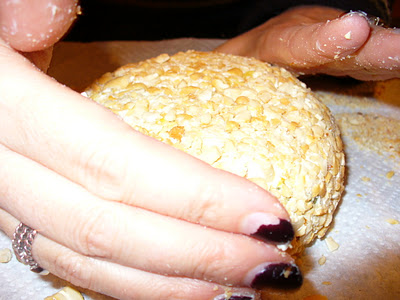 Forgive the chipping nail polish. Once you have the ball nicely shaped and covered in nuts, place it in the center of a pretty serving plate.