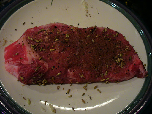 3. Remove fennel from skillet and set aside. Add a bit more olive oil to pan. Coat all sides of steak with remaining seasoning mixture. Add steak to pan. Cook about 5 minutes per side, or until desired degree of doneness.