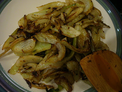 2. Heat olive oil (enough to coat your pan) in a skillet over medium heat. Add half of seasoning mixture to pan and the sliced fennel. Saute for 15 or 20 minutes, stirring periodically, until the fennel is soft and starting to caramelize and brown.