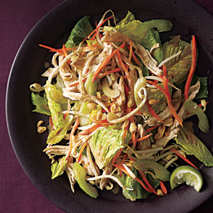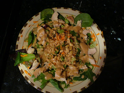 I threw this together last night in about 10 minutes. I roast a chicken once a week or so just for purposes like this, so I had pre-cook chicken breasts in my fridge. I also had some mixed organic salad greens. I shredded a carrot and chopped up a celery stalk. I didn’t have bean sprouts, so I left those out. I did have peanuts, so I chopped those up real quick with my Pampered Chef food chopper.