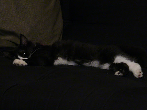 Morning nap lasts until mid-morning. More snacks and then some investigating of the house, followed by playtime, some pets and purring, and then our long afternoon nap. Our afternoon nap can be several hours long.