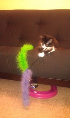 Evening time is time for more EPIC energetic jumping, running and chasing playtime! We like the laser, the shiny/jingly toy, fuzzy feathers and to chase the balls. We also like cardboard, wrapping paper and rope with knots tied in it.