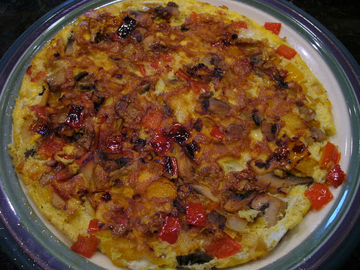 I had pre-chopped onions, red and yellow peppers, and had bought sliced mushrooms. I sauteed those in a little butter until they were nice and soft. (After eating it I would have added the eggs sooner and let all the cooking finish together, the onions got a bit more carmelized than I would have liked). Then I beat some eggs together and poured those over the top of the veggie mixture. I let that cook without touching it (I swirled the eggs around in the pan when I first dumped it all in there to cover the veggies) for a few minutes until the edges looked like they were just starting to set. I then took the whole pan and stuck it in a 350F oven for another few minutes until the top set up. I sprinkled a tiny bit of cheese on the top and let that melt.
