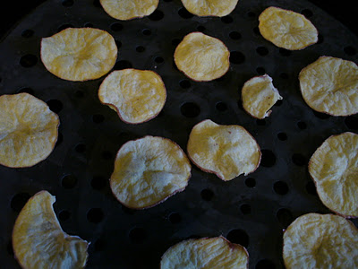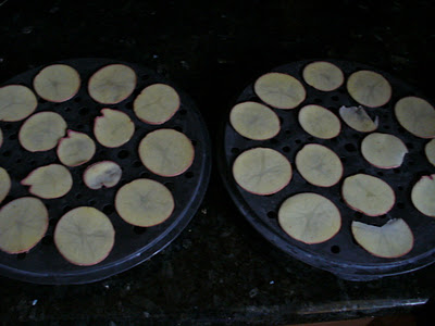Put them on the trays (after patting them dry with a paper towel) and stick them in the microwave for a few minutes. The instructions say 3 minutes, but they must have used a higher powered microwave than mine, because it took probably 6 minutes or so (30 second increments) for the potato slices to crisp up like chips!
