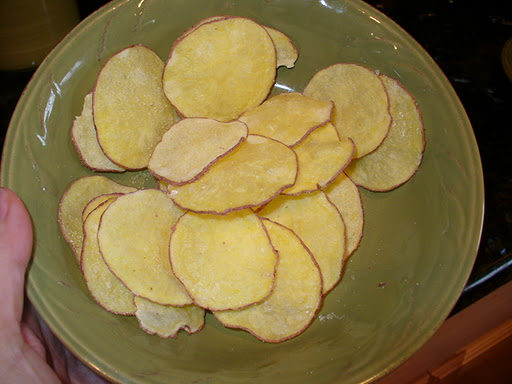 I seasoned them with a bit of vinegar and salt. YUM! Quick, homemade, no oil/deepfried potato chips! Thanks Gram!