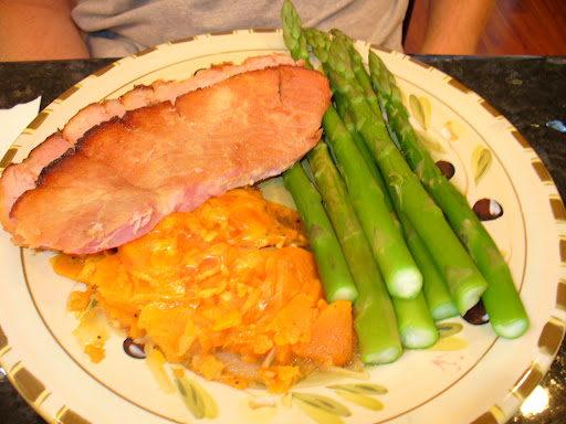 | Last years Easter dinner. I didn’t take pictures this year, but the ham is the same recipe and we had asparagus, too. |