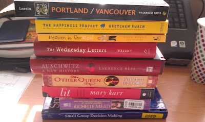 Hey Corrie, if it isn't already taken, I would be interested in reading Heaven is Real (do I have to pay postage if you bring it when I see you Monday?). Also, you might consider donating that small group communication book on the bottom of the pile in the photo back to the department — it can be put on reserve at the library for future students who cannot afford to buy the textbook.
