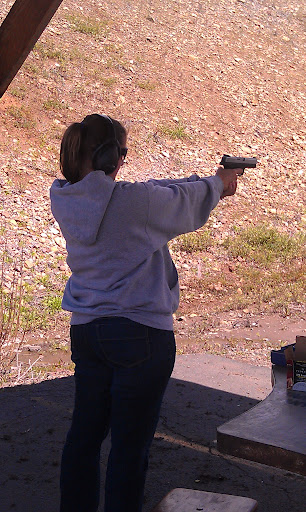 Then I shot the pistol. Uhm…or rather I *tried* to shoot the pistol. I literally could not fire it. Apparently the trigger is very heavy (<–gun lingo) which is a safety feature of sorts I guess. Anyway, after much effort I managed 3 shots. That was it. A little later that afternoon I managed 3 more shots, but I did not have enough strength in my finger to actually make it fire. CRAZY! Chris thought that it was malfunctioning! Nope…just weak baby fingers, I guess!