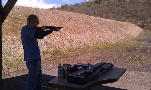 The last one we shot was the 12 gauge shot gun. Yes, it is hella loud and yes it packs a helluva kick! My shoulder was pretty darn sore the next day.