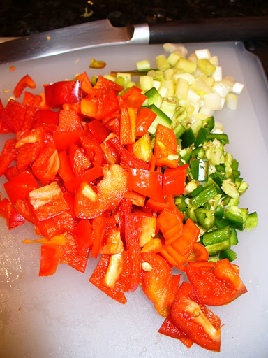 This is garlic, jalepeno, new mexico chile, red bell pepper, and the white parts of green onions.