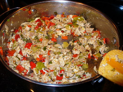 This is where you make it your own. Garlic and onions are a good place to start, peppers, jalapenos, diced green chili’s…whatever you want to have mixed with your chicken and cheese on the inside of the enchilada. Sliced black olives are good, whatever, be creative!