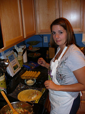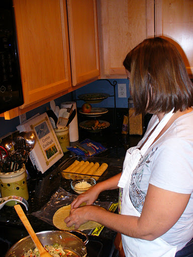 Next set up a little assembly line with your stuffing mixture, the tortillas, whatever shredded cheese you are using and your 13 x 9 baking dish. Now start stuffing!