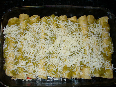 Next, stick it in a 350 degree oven for 10-20 minutes, until it is all hot and bubbly and the cheese is ooeygooey melty. The time will depend on how full you stuff your enchiladas, how much and what kind of cheese you used, etc.