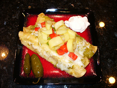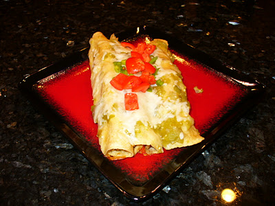 My original recipe was a flour tortilla with a red enchilada sauce (storebought) stuffed with, at a minimum, shredded chicken and cheese. Seriously simple. And delicious.