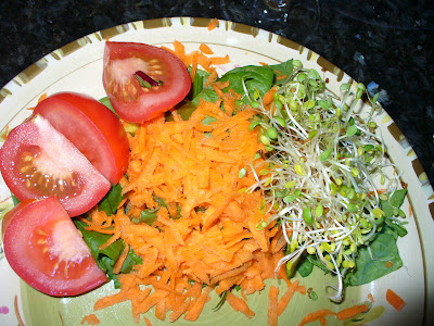 | lettuces from the garden, dill pickle, tomato, shredded carrot, sprouts |