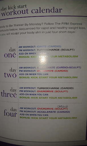 I also have a plan for the next few weeks. I am once again following the FIRM Express workout plan and am utilizing (some) of their menu. I am kicking this off with the 4-Day Kick Start Plan.