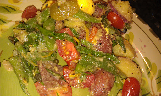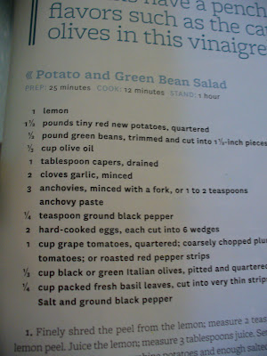 The dressing consists of grated lemon peel, lemon juice, the olive oil, capers, garlic, anchovy paste and pepper. Shake it up or mix it and you have your dressing. The salad itself is potatoes, boiled, hard boiled eggs, green beans cooked, and tomatoes, olives and fresh basil! Mix it all together, let it set for a bit, and enjoy!