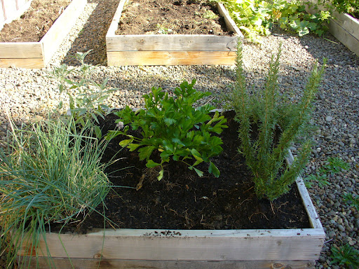 I previously had my herbs (chives, rosemary, thyme, sage) scattered around in various places, and since they over-winter they sometimes got in the way of really turning the dirt in the spring in the boxes they were in. Solution: put them all in this one box! It makes me crazy happy. In the middle there is the celery I planted from a celery end earlier this year. It is growing, but not like a celery plant you see in the store. I figured I’d just let it ride and see what it does.