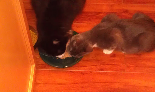 | Well lookie there….Roxie & Daisy eating off the same plate…and everyone is still alive! |