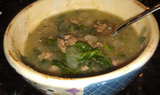 I browned some seasoned pork sausage in a big stockpot. I removed that from the pan and saved just enough of the grease to saute an onion and a big scoop of minced garlic in. Once that was nice and soft and aromatic, I took about 5 cups or so of previously homemade chicken broth and added it to the pan with the onions, along with the previously cooked sausage. I half moon sliced up some potatoes and added those to the mix as well. Then I just let it simmer for quite a long time to let the potatoes “overcook” a bit so they would break down and create a creamier consistency of soup. I added a bit of salt and pepper toward the end, along with about a half a teaspoon of fennel seed. Just before serving I tossed in about 3/4 of a bag of pre-washed chopped kale and let it wilt.