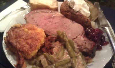 Prime rib, corn casserole, green bean casserole, home made cranberry sauce, and baked potatoes.