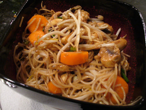 This one is Korean Noodle Salad, again SO easy, SO good! Basically: chop up a carrot, green onion and some mushrooms, put them in a big salad bowl. Add bean sprouts to bowl. Boil some thin pasta (I used Spelt Angel Hair) and dice and cook some chicken. Drain the pasta and add it and the chicken to the veggies. Take minced garlic, 2-3 teaspoons each (or more depending on how much you make) of soy sauce, balsamic vinegar and sesame oil and mix in a small bowl or measuring cup. Pour over chicken mixture and toss everything together. Serve!! Of course, you can mix the veggies up to whatever you have or like, but this is a pretty tasty and very quick to put together dinner.