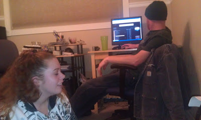 Ta da! One single surface for us to work on! Chris took the keyboard slide out tray off of my old desk and mounted that on his side. I don’t use my wireless keyboard often, so it wasn’t a big concern for me.
