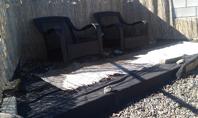 The last bit of work for me yesterday was to put the weed barrier (cat barrier) and bamboo cover back on my sandy beach. I cleaned all the leaves and debris off of them, and then off the sand and raked it up. It is nice and pretty and clean now and will be ready for sunny summer days with my toes in the sand.
