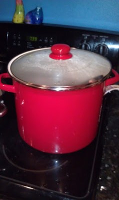The only tricky thing about making stock with that much water is that you have to put it on high to get it boiling, but then you have to turn it down so that it is just a simmer, but if you turn it down too much it doesn’t simmer and if it is too high it is closer to a boil. Since there is so much volume and it takes so long for the temperature change to be reflected, it takes a bit of monitoring and up and down adjustment on the stove to get it right. Once I got it to a simmer that I liked I just left it alone for about 4 hours or so. Then I just turned the burner off and let it cool. I ended up with A LOT of stock.