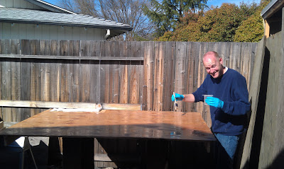 Chris is still working on his boat, but now he is getting the floor prepared.